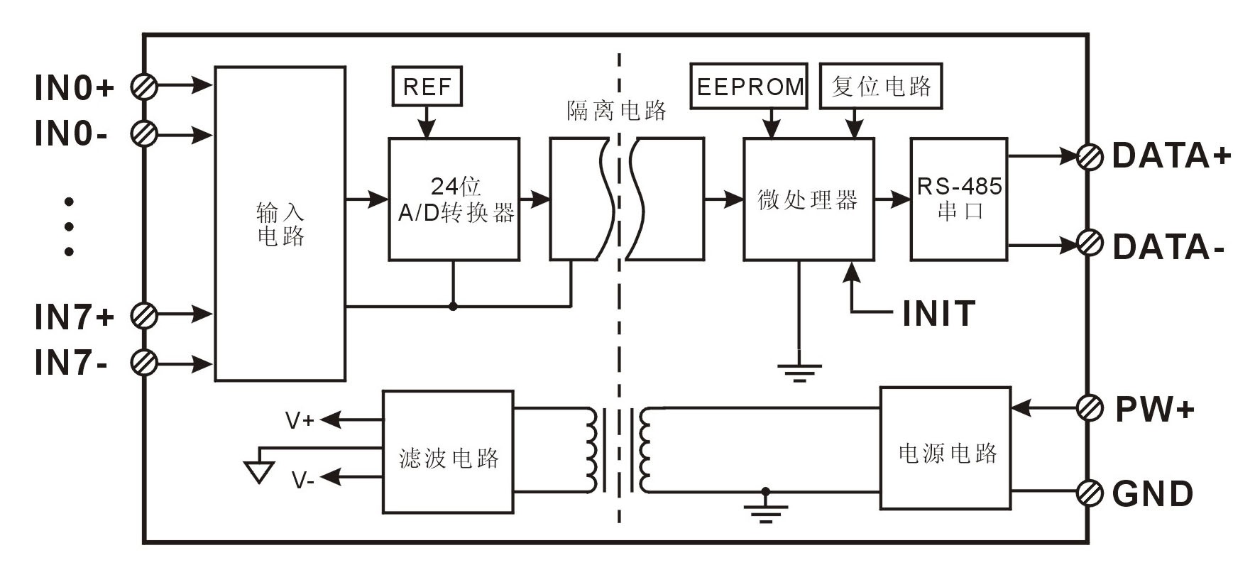 24位采集精度,8路模擬信號輸入。產(chǎn)品出廠前所有信號輸入范圍已全部校準(zhǔn)。在使用時(shí),用戶也可以很方便的自行編程校準(zhǔn)。具體電流或電壓輸入量程請看產(chǎn)品選型。